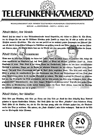 ![]()  | 				The Telefunken Company Comrade: Our Führer is 50 17th August 1939: My mother emigrates to England 26th January 1943: Grandmother und Grandfather Reiss are deported to Theresienstadt  | 			|