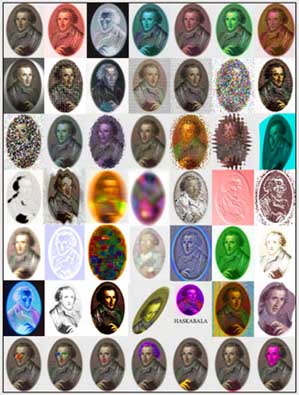 | Hascabbala Hascala meets Cabbala 7 x 7 (Photo-Collage) Hascala is the Hebrew word for Jewish enlightenment. Cabbala is about Jewish mysticism. The number '7' plays a central role in Cabbala because God created the World in 7 days. The photo-collage shows the effect of a power field of 49-images of Moses Mendelson influenced by the magic of the Cabbala. | | | |