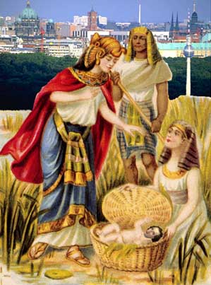 | The Truth About Moses Arrival in Berlin (Photo-Collage) Rumours have it that Moses Mendelson appeared at a northern gate of 18th century Berlin and was at first refused access. The truth is that a basket with Moses Mendelson in it was found by some Berliners on the bank of the River Spree. | | | |