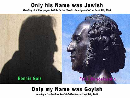 | Felix & I (Photo-Collage) Felix-Mendelson-Bartholdy has always been defined as a Jewish composer. The truth of it is that his father had converted to Protestantism and that Felix was strongly influenced by Christian beliefs. His music is in no way specifically 'Jewish'. I found the article heading from the leading German Jewish weekly somewhat provocative. This photo-collage is my way of replying. | | | |