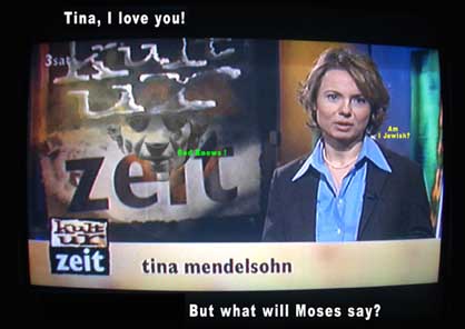 | Tina I Love you (Photo-Collage in Backlight Box) Tina Mendelsohn is an anchorwoman on Germany's leading daily culture programme 'Kultur Zeit' (Time for Culture). She is rather attractive. Her family background is unclear; in fact she may have gained the name Mendelson through marriage. In any case Moses gives a clear answer which has a double meaning: God KNOWS or GOD knows….. | | | |