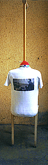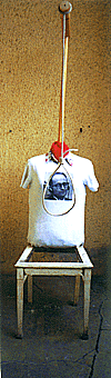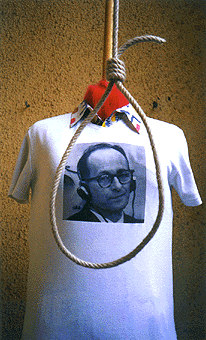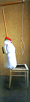 | In 1961, Adolf Eichmann went on an involuntary Journey to Jerusalem. He had been found in Argentina by the Israeli Secret Service and was subsequently abducted to Israel. His court case in Jerusalem lasted for months and ended with a death sentence. Eichmann was hung and his ashes were strewn over the Mediterranean Sea. Photos of his trial went round the world and still stick in many people's memories. | | The installation Musical Chairs Jerusalem 1961 relates to both contexts. On the one hand, a chair like in the children's game is at the centre of the installation, but one cannot sit on it. It was Eichmann's first (and last) journey to Jerusalem. The hole in the chair and the rope above reflect on the way Eichmann died. When a sentenced person is hung the floor beneath him gives way. The last chair in this game remains empty. This game knows no winners only losers: Eichmann's victims and finally he himself. Ronnie Golz, April 2001 | |