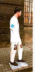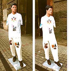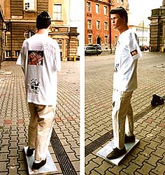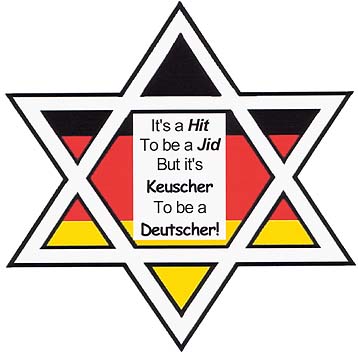 "It's a Hit to be a Yid But it's Keuscher to be a Deutscher!" is on the front of his T-Shirt. It is implanted in a Star of David which itself is in the colours of the German flag: black-red-gold.
