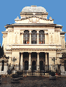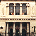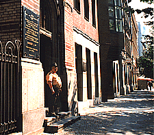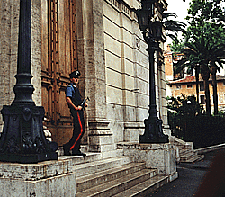 | The difference in appearance between the Italian carabinieri and the German policeman couldn't be greater and at the same time more honest! While the Italian emphasises elegance, appearance and pose, his German counterpart stands like a teddy bear on the steps. But the same applies to both: the protectors of the synagogues (or the women?) are in reality their poodles. | The actual links between Germany and Italy in the photomontage are the two representative synagogues of Rome and Berlin and the fact that Jewish life in both countries requires police protection in front of their houses of God. Berlin, October 2000 | |||