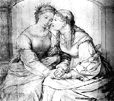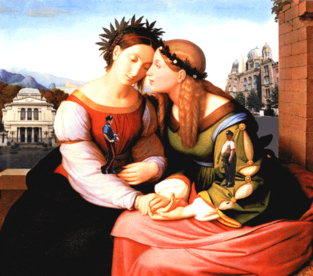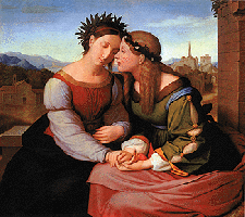| I first saw "Italia and Germania" during a visit to the Neue Pinakothek in Munich. Friedrich Overbeck (3.7.1789 Luebeck 12.11.1869 Rome) painted it between 1811 and 1820. The painting is based on a chalk drawing of Shulamit und Mary. Shulamit, a Jewish woman named in verse 7 of Solomon's Song, rests her head against Mary the symbol of Christian motherhood. Overbeck belonged to the 'Nazarenes', a group of German romantic artists, who between 1810 and 1830 strove to renew art in a religious context. | ||||