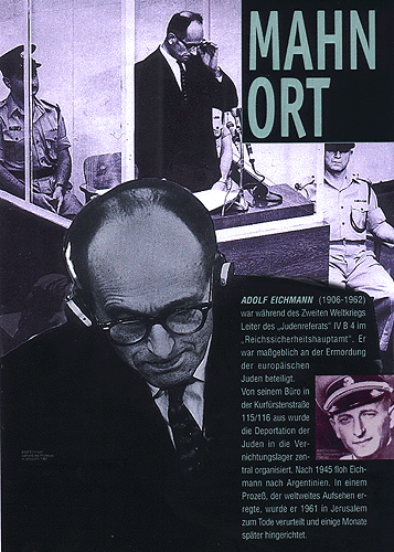 ![]() | Adolf Eichmann war während des Zweiten Weltkriegs Leiter des "Judenreferats" IV B 4 im "Reichssicherheitshauptamt". Er war maßgeblich an der Ermordung der europäischen Juden beteiligt. Von seinem Büro in der Kurfürstenstrasse 115/116 aus wurde die Deportation der Juden in die Vernichtungslager zentral organisiert. Nach 1945 floh Eichmann nach Argentinien. In einem Prozeß, der weltweites Aufsehen erregte, wurde er 1961 in Jerusalem zum Tode verurteilt und einige Monate später hingerichtet. | ||