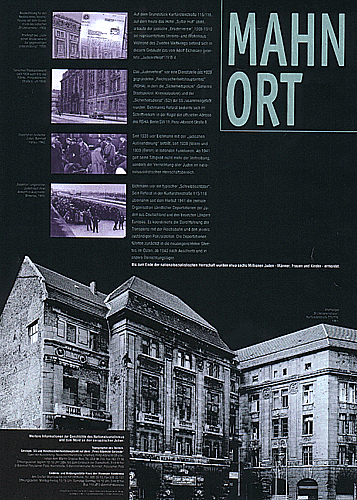 ![]() | Auf dem Grundstück Kurfürstenstrasse 115/116, auf dem heute das Hotel "Sylter Hof" steht, erbaut der jüdische "Brüderverein" 1908-1910 ein repräsentätives Vereins- und Wohnhaus. Während des Zweiten Weltkriegs befand sich in diesem Gebäude das von Adolf Eichmann geleitete "Judenreferat" IV B 4. Das "Judenreferat" war eine Dienststelle des 1939 gegründeten "Reichssicherheitshauptamtes" (RSHA), in dem die "Sicherheitspolizei" (Geheime Staatspolizei, Kriminalpolizei) und der "Sicherheitsdienst" (SD) der SS zusammengefasst wurden. Eichmanns Referat bediente sich im Schriftverkehr in der Regel der offiziellen Adresse des RSHA: Berlin SW 11, Prinz-Albrecht-Straße 8. Seit 1935 war Eichmann mit der "jüdischen Auswanderung" befasst. Seit 1938 (Wien) und 1939 (Berlin) in leitenden Funktionen. Ab 1941 galt seine Tätigkeit nicht mehr der Vertreibung, sondern der Vernichtung aller Juden im nationalsozialistischen Herrschaftsbereich. Eichmann war ein typischer "Schreibtischtäter". Sein Referat in der Kurfürstenstrasse 115/116 übernahm seit dem Herbst 1941 die zentrale Organisation sämtlicher Deportationen der Juden aus Deutschland und den besetzten Ländern Europas. Es koordinierte die Durchführung der Transporte mit der Reichsbahn und den jeweils zuständigen Polizeistellen. Die Deportation führten zunächst in die neueingerichteten Ghettos im Osten, ab 1942 nach Auschwitz und in andere Vernichtungslager. Bis zum Ende der nationalsozialistischen Herrschaft wurden etwa sechs Millionen Juden Männer, Frauen und Kinder ermordet. | ||