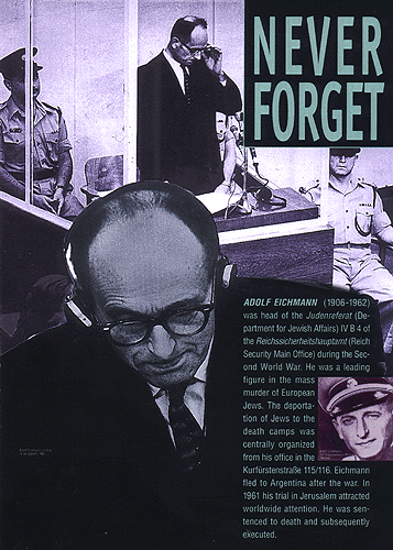 | 				  | 				 | 				Adolf Eichmann (1906-1962) was head of the 'Judenreferat', (Department				for Jewish Affairs) IV B 4 of the Reichssicherheits-hauptamt (Reich				Security Main Office) during the Second World War. He was a leading				figure in the mass murder of European Jews. The deportation of				Jews to the death camps was centrally organized from his office				in the Kurfürstenstraße 115/116. Eichmann fled to Argentina after				the war. In 1961 his trial in Jerusalem attracted worldwide attention.				He was sentenced to death and subsequently executed. |